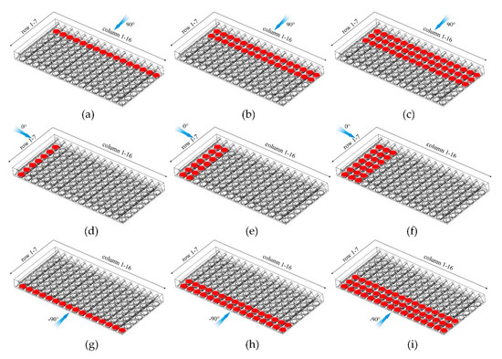 As is known in previous research, the first few rows of windward condenser cells are affected seriously by ambient wind and the air flow rates of fans get drastically reduced. For improving the performance of axial flow fans in the presence of winds, the thermo-flow characteristics of DDCS are investigated by adjusting the rotational speed of the windward fans while keeping the total power consumption of fans constant in this work. As shown Figure 2a–i, all of the cooling fans are divided into two parts, the windward fans and the other fans. Three different methods are proposed to partition: the first row on the windward side and the others (case 1); the first two rows and the others (case 2); and the first three rows and the others (case 3). The rotational speed of fans in the windward block is adjusted to 90% n0, 95% n0, 105% n0 and 110% n0, respectively, and the other fans also make corresponding adjustments. Each strategy is named according to the adjustment method, that is, the case for adjusting the rotational speed of fans in the first windward row to 90% n0 is named 90-case 1, and so on.
