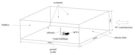 The boundary conditions are shown in Figure 3, with the wind direction of 90° as an example. The windward surface is set as the velocity inlet and the opposite surface is the outflow. Both sides and top surfaces are considered to be symmetry. The ground is specified as the non-slip and adiabatic wall and the standard wall functions are adopted. The boundary conditions for the other two wind directions are similar. The operating temperature is 290.15 K. The computational domain is a 2400 × 2400 × 720 m cube, which is large enough to enhance the calculation accuracy and reliability. The details of the boundary conditions are listed in Table 2.