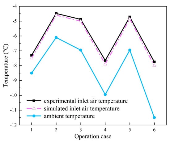 By a spot experiment based on a 4 × 600 MW direct dry cooling power plant [11], the inlet air temperature of a certain condenser cell is obtained under the rated load. The model of the power plant was established and a numerical simulation was carried out. The comparison of the experimental and numerical results for the same condenser cell is shown in Figure 4. It can be found that the difference in the inlet air temperature is small enough. Moreover, the experiment of a scaled model of a condenser cell was also made [34], and the comparison with the simulation results shows that the maximum relative error of heat rejections is 10.57% for all cases. The aforementioned comparisons all prove that the computational models and simulation methods, which are adopted in this work, are reliable in predicting the performance of DDCS.