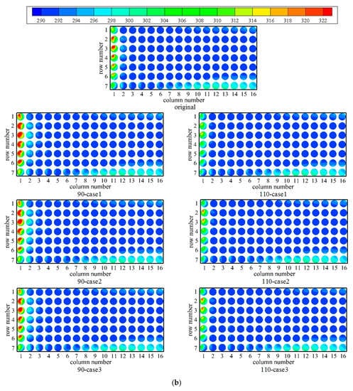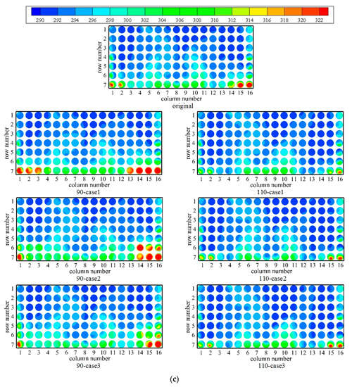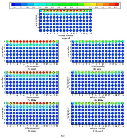 Figure 5 shows the inlet air temperatures of the axial flow fans in three wind directions at the wind speed of 12 m/s for seven representative cases. When the rotational speed of the windward fans is reduced to 90% n0, the inlet air temperatures of the first few rows on the windward side are clearly higher than the original case, while the tendency is reversed when the speed of the fans in the windward block increases to 110% n0. The temperature improvements for 110-case 1 are the most conspicuous in all of the wind directions. Besides, the temperature distributions of the downstream fans are hardly affected, although the rotational speeds are also adjusted. It can be concluded that the inlet air temperatures will be reduced by increasing the rotational speed of the fans on the windward side, which is beneficial to the operation of air-cooled condensers.