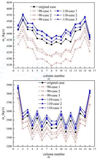 When the wind speed increases to 12 m/s, as shown in Figure 6b, the mass flow rates of Column 1 and Column 16 are the largest and much higher than the others, because the influence of hot plume recirculation flows on both sides is weak and the reversed air flows on the windward condenser cells are serious at a high wind speed. The results of 90-case 1 and 90-case 2 are relatively close and obviously better than 90-case 3. The improvement of 100-case 3 is biggest, while 100-case 1 and 100-case 2 are almost the same.