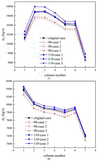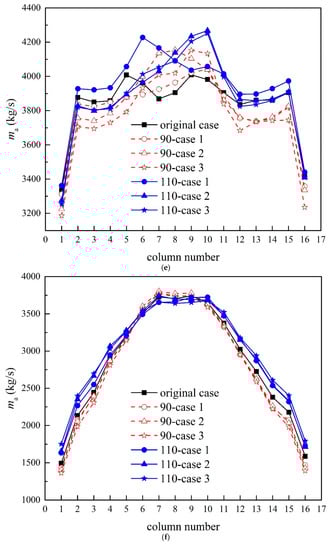The distributions of the mass flow rates in the wind direction of −90° are arched and roughly symmetrical, as shown in Figure 6e,f. At the wind speed of 3 m/s, the mass flow rates of all columns for 110-case 1 increase compared with the original case. For other cases, only the mass flow rates in the middle columns are improved significantly. Besides, the air flow rates on both sides’ columns have been greatly reduced for 90-case 1, 90-case 2 and 90-case 3, but are not changed much for 110-case 2 and 110-case 3. At the wind speed of 12 m/s, the mass flow rates for 90-case 1, case 2 and case 3 are increased in the middle columns and reduced in the other columns. However, the situations of 110-case 1, 110-case 2 and 110-case 3 are just opposite. In general, the increases in the total mass flow rates for 110-case 1, 110-case 2 and 110-case 3 are obvious.