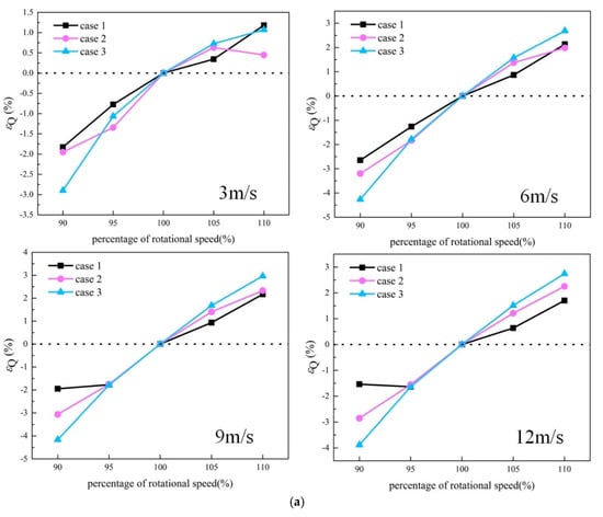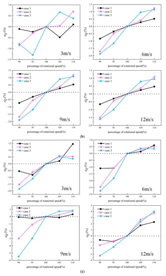 Figure 7 gives the εQ for all cases under the same windy condition. In Figure 7a, the improvement in heat rejection in the wind direction of 90° at various wind speeds is presented. Generally speaking, the heat rejection gets larger as the rotational speed of the fans in the windward block increases by using the same partition method. The heat rejection for 110-case 1 is largest at the wind speed of 3 m/s, and 110-case 3 performs best when the wind speed is greater than 6 m/s. Moreover, the largest improvement in heat rejection at the wind speed of 3 m/s is only 1.18%. When the wind speed is higher than 3 m/s, the εQ is close to 3%.