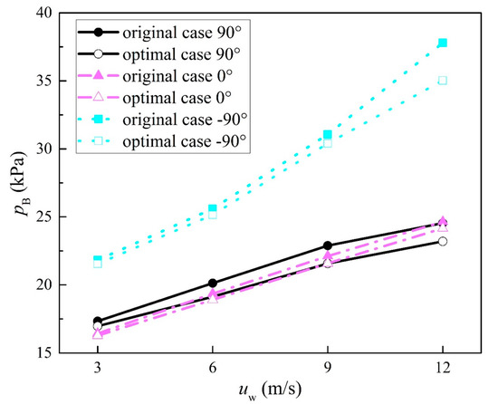 As shown in Figure 8, the turbine back pressure in the wind direction of 90° is very close to that in the wind direction of 0°, while it is much higher in the wind direction of −90°. The back pressures in the wind directions of 90° and 0° increase almost linearly while it changes dramatically in the wind direction of −90° with the wind speed. The differences between the optimal cases and original cases are always small in the wind direction of 0° and reach the largest value of 0.53 kPa at the wind speed of 9 m/s. In the wind direction of 90°, the back pressure drop is slightly larger than the former and the largest back pressure drop is 1.34 kPa at the wind speed of 12 m/s. In the wind direction of −90°, the back pressure drop is not significant at low wind speeds, but increases sharply to 2.77 kPa when the wind speed reaches 12 m/s.