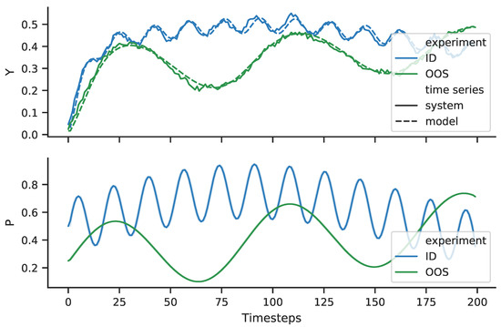 System response and fitted model response (Y–space) excited by the excitation signal P. Identification experiment ID and out-of-sample experiment OOS.