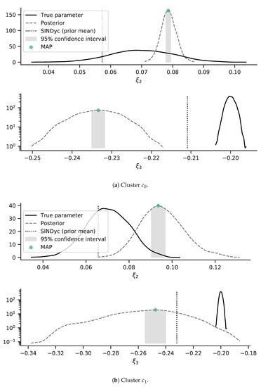 As the kernel density estimation bandwidth, we used Scott’s rule as given in [37]. The approximated posterior distributions are depicted in Figure 4a alongside the true parameter distributions and the parameter mean inferred by SINDyc. We can observe that the inferred parametric uncertainty was comparably reduced in cluster (see Figure 4a) in comparison to cluster (see Figure 4b). The posterior PDF deviated from the true system’s parametric distributions. Hereby, the parametric mean of the SINDyc models provided a higher precision with respect to the true system’s parametric mean than the inferred parameters.