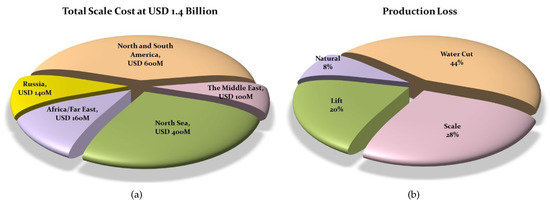 The main reason for downhole solid precipitation is the disturbance of the thermodynamic equilibrium that exists between underground fluids and their surroundings, which occurs due to drilling and production operations. These deposits may have an organic nature, when they are generally called “wax” or “asphaltenes” [1,2,3], or may have an inorganic nature, when they are called “scale” [4,5]. The thickness of the developed scale in thermal wells is variable, depending on the pressure, temperature and water chemistry of the well; however, in general, the thickness may range from 0.7 cm to more than 3 cm, leading to a 10–45% fluid restriction [6]. Furthermore, the type of the scales used in the petroleum industry varies considerably. Habibi et al. (2020) [7] categorized the mineral composition of scale deposits removed from completion tools. They showed that the inorganic scale deposits are mainly silicates, carbonates and corrosion products. The iron-based scales are reported to be a result of the corrosion in the tubulars. The location of scale deposition may be anywhere inside the formation—e.g., around the wellbore, in the production string or inside perforations—which may lead to a considerable decline of production [8]. In addition to the loss of production, as displayed in Figure 1a, subsequent scale removal or the application of scale inhibitors may cost up to USD 1.4 billion annually [9]. As depicted in Figure 1b, of the major production loss factors in the North Sea region, scale contributes to 28%, and a similar trend is expected for mature fields around the world [8].