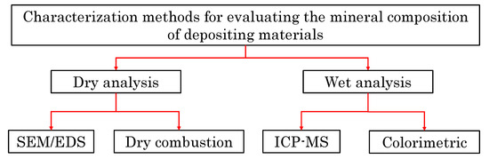 A laboratory protocol was implemented to characterize the mineral composition of the scale deposits. Figure 2 shows a flowchart of the characterization methods used to evaluate the mineralogy of these samples collected from the completion tools in thermal wells. This protocol is composed of four different steps: (I) SEM/EDS analysis to visualize and evaluate the elemental spectrum of the scale deposits, (II) ICP-MS analysis to quantify metallic components, (III) colorimetric analysis to quantify the sulfate and chloride components and (IV) dry-combustion analysis to quantify the organic and inorganic carbon contents of these samples.