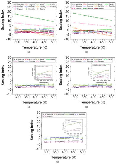 Scaling Index versus temperature for (a) well A, (b) well B, (c) well C, (d) well D and (e) well E. The main scaling minerals for samples A and B are FeO, FeOOH and Fe(OH). Samples C and D are Fe-free samples. For these samples, CaCO can precipitate. CaMg(CO) can precipitate from sample E when T < 398 K.