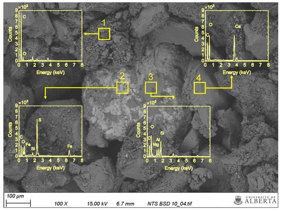 Figure 4 shows the SEM image and EDS spectrum for different regions of the first scale sample. Each region has a specific spectrum composed of different peaks. This variation shows the mineral heterogeneity of the scale samples. This observation is in agreement with previous studies that showed the mineral heterogeneity of depositing minerals [7,37]. In this sample, there are four regions with different components: (1) organic matter, (2) iron sulfide, (3) Mg-based silicates and (4) calcite/aragonite.