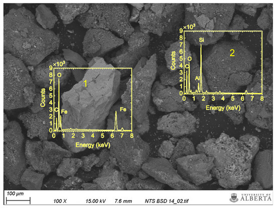 Table 5 lists the TC, TOC and TIC contents evaluated for five scale deposits using the dry combustion method. TIC is the difference between TC and TOC. Since a limited amount of the scale deposits was available for the analysis, we could not perform the extraction analysis to separate carbonate (CO) from bicarbonate (HCO). First, the TC concentration for atropine (external reference standard) is 70.54 wt%. This value is very close to the known value (70.56 wt% for TC). Next, the TOC content is in the range of 9.15–11.5 (w/w)%. The oil API for thermal wells is low, meaning that heavy oil is produced from these wells. The source of organic carbon could be the heavy components of the produced oil or bitumen, such as asphaltenes, and resins precipitated on the surfaces of the tubular during the oil production. The results of the saturates, aromatics, resins and asphaltenes (SARA) analysis for the Athabasca and Cold Lake bitumens are reported in the literature [38,39]. The concentration of asphaltenes and resins for the Athabasca and Cold Lake bitumens are 43.03 and 40.06 wt%, respectively [38]. Region 1, highlighted in Figure 4, shows the existence of organic matter in the scale deposits. Mixing the organic matter with inorganic scales results in formation of more complex deposits in terms of physicochemical properties compared to pure inorganic scale deposits. Moreover, the concentration of TIC changes from 5.31 to 6.08 (w/w)%. This shows that up to 6.08 wt% of scale deposits could be carbonate and bicarbonate-based components. These components could be aragonite, calcite, magnetite and siderite based on the concentration of metallic ions presented in Table 3.