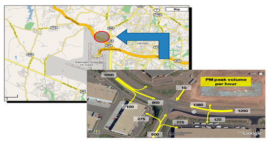 The test intersection is typically used as a substitute route for airport travelers. The speed limit is 88 km/h for eastbound and westbound and 40 km/h for northbound and southbound. Northbound and southbound traffic is controlled by two-way stop signs. The average afternoon peak hour traffic volumes are shown in Figure 1. Virginia 606 is a four-lane corridor with an extra left-turn lane, and Ariane Way has two lanes. While traffic volume is low during non-peak hours, travel time and delays are significantly increased at the two-way, stop-controlled intersection during peak hours. The typical queue length at Ariane Way is from 10 to 15 vehicles and those vehicles make for unsafe gap-acceptance maneuvers through the high-speed approaching vehicles from eastbound and westbound directions.