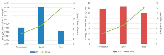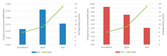 Figure 2 compares the simulated ICEV fuel consumption and BEV energy consumption at a roundabout, a signalized intersection, and a two-way stop-sign-controlled intersection for an approach speed of 88 km/h. BEVs and ICEVs clearly had different energy/fuel consumption patterns. We converted ICEV fuel consumption to a comparable energy consumption unit, kWh based on Reference [21]. Based on the report, one liter of gasoline contains the energy equivalent to 8.9 kWh of electricity. The fuel consumption of ICEV increased by 126% and 79% when the stop-sign-controlled intersection was replaced with a roundabout and a signalized intersection, respectively. In contrast, for BEVs, the roundabout reduced energy consumption by 2.3% and 8.4% compared to the stop-sign-controlled and signalized intersections, respectively. The roundabout decreased total delay by 68% (from 18.81 to 6.07 s/veh) compared to the stop-sign-controlled intersection and by 45% (from 8.78 to 6.07 s/veh) compared to the signalized intersection. These results demonstrate that, for the modeled intersection, a roundabout would improve BEVs’ energy efficiency, whereas ICEVs would have better fuel economy at a two-way stop-controlled intersection.