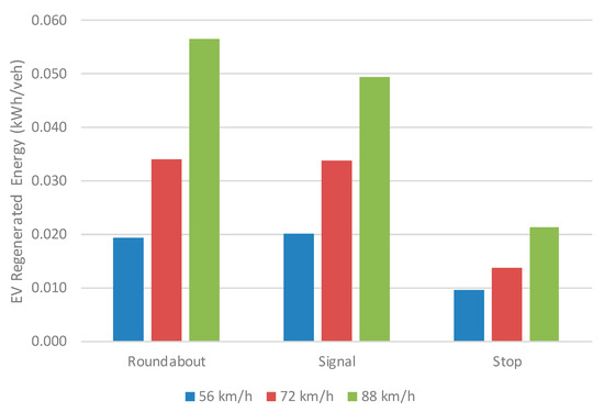 Figure 5 illustrates the average recovered energies corresponding to the three intersection controls at different approach speeds. The regenerative energy produced increased with increasing approach speed. For the roundabout, BEVs generated 193% more regenerative energy at an approach speed of 88 km/h compared to an approach speed of 56 km/h. Figure 5 also demonstrates that BEVs recovered more energy at the roundabout compared to the signalized and stop-sign-controlled intersections. Table 1 shows the percentage of regenerated energy compared to total BEV energy consumption. For example, BEVs recovered 32.9% of the total energy through regenerative energy at the roundabout with an approach speed of 88 km/h. These results indicate that regenerative energy is critical to BEVs maintaining their energy efficiency at roundabouts.