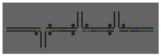 A number of studies have investigated the effects of traffic controls on ICEVs and developed optimum traffic signal controls to reduce fuel consumption and emissions. Varhelyi investigated the effects of small roundabouts on emissions and fuel consumption [5]. Coelho et al. [6] utilized a vehicle-specific power method to evaluate fuel consumption and emissions impacts on roundabout intersections in Raleigh, North Carolina and in Lisbon, Portugal. Researchers from Kansas State University utilized video-recorded traffic flow through the roundabout to extract speed, acceleration, deceleration, and other characteristics, and evaluated the emission impacts of roundabouts using SIDRA software (SIDRA SOLUTIONS, Balwyn, Australia) [7]. Ahn et al. [8] investigated the impacts of fuel consumption and emissions on a high-speed roundabout using a traffic simulation model. Kwak et al. [9] investigated the effects of traffic signal optimization on fuel and greenhouse gas emissions in an urban corridor and optimized traffic signal timing plans based on vehicle fuel consumption using a genetic algorithm. Park et al. [10] introduced a sustainable traffic signal control system and demonstrated that the system could reduce fuel consumption and pollutants with moderate increases in vehicle delays and number of stops. Stevanovic et al. [11] developed a fuel optimum traffic control system by integrating the Comprehensive Modal Emission Model and Vissim-based genetic algorithm optimization of signal timings with the Vissim traffic simulation model. Michel et al. [12] investigated the potential impacts of connected and automated vehicles on fuel consumption and found that the connectivity removed some stops and strong accelerations and increased overall vehicle speed, concluding that the best fuel consumption levels for hybrid electric vehicles and BEVs are achieved with connectivity.