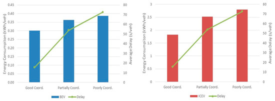 BEV and ICEV energy/fuel consumption for different signal coordination plans.