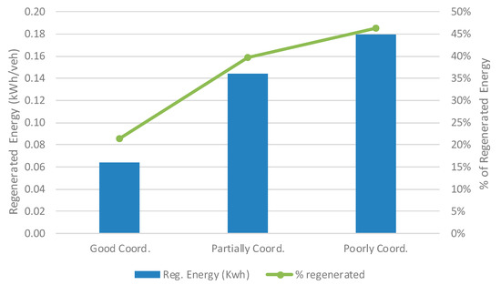 Figure 7 illustrates the effects of different signal coordination plans on BEV and ICEV energy/fuel consumption and vehicle delay. As expected, the well-coordinated signal plan significantly reduced vehicle delay from 72.64 s to 15.51 s compared to the poorly coordinated signal plan. The well-coordinated signal plan also reduced vehicle delay by 26% compared to the partially coordinated signal plan. Figure 7 also shows that the well-coordinated signal plan improved energy/fuel efficiency in both ICEVs and BEVs. In particular, ICEVs’ fuel consumption was reduced by 28% and 35% compared to the partially coordinated and poorly coordinated signal plans, respectively, while BEVs’ energy efficiency was improved by 17% and 20%, respectively. These results indicate that BEVs’ energy consumption was less sensitive to signal coordination than ICEVs’ fuel consumption, since BEVs produced more regenerative energy on the corridors with partially and poorly coordinated signal plans. The BEVs recovered 21%, 40%, and 49% of total energy through regenerative braking for the well-coordinated, partially coordinated, and poorly coordinated signal plans, respectively, as illustrated in Figure 8.