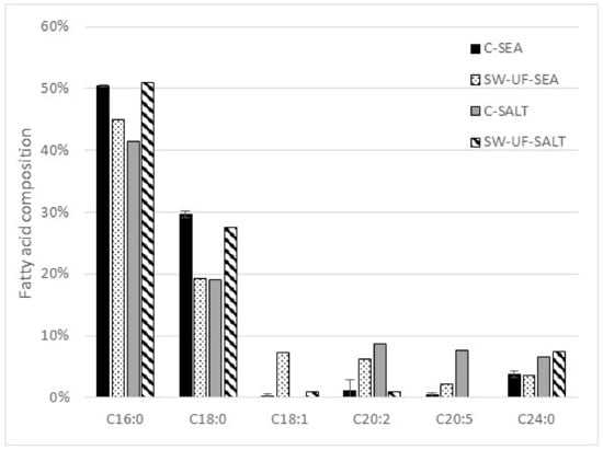 The growth and fatty acid productivity of P. cruentum was evaluated in control and diluted ultra-filtered swine wastewater. Figure 1 shows the biomass productivity of each culture. For the samples grown in seawater, those containing treated swine wastewater (SW-UF-SEA) had almost double the average biomass productivity (5.18 mgL−1day−1) than those grown in the control medium (C-SEA, 2.61 mgL−1day−1). Alternatively, for the samples grown in saltwater, those containing swine wastewater (SW-UF-SALT) had about half the average biomass productivity (3.31 mgL−1day−1) of those grown in the control medium (C-SALT, 6.52 mgL−1day−1). However, it is important to note that there was wide variation among the samples and, therefore, the average biomass was statistically the same. A previous study by Lee and Bazin (1991) determined that the optimum growth for P. cruentum occurred at a similar concentration of NaCl to our saltwater samples (0.42 M ~ 24.5 ppt), and that the next highest growth occurred at a concentration of NaCl similar to our seawater concentration (0.59 M ~ 34.5 ppt) [30]. Overall, the average biomass productivity was statistically the same between the microalgae grown in the control media and the microalgae grown in the treated swine wastewater media, as indicated by p≥, as shown in Table 2, for the different analysis methods. This indicates that ultra-filtered swine wastewater can be used to grow microalgae (specifically P. cruentum) without any significant loss to the biomass productivity.