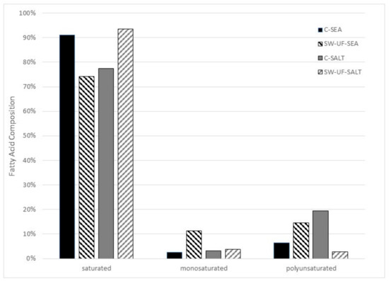 Saturated and unsaturated fatty acid compositions of P. cruentum grown in control and treated swine wastewater media. N = 2 for C-SEA and SW-UF-SEA, N = 1 for C-SALT and SW-UF-SALT.