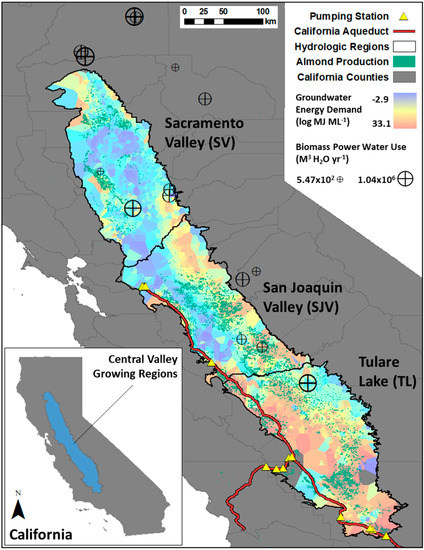 The productivity of the CV agricultural economy is made possible by two major water sources: Sierra Nevada snowpack and CV aquifers. Surface water flow from the Sierra Nevada to the CV is gravity-driven, and is utilized in hydroelectric generation on its way (Figure 3). The distribution of surface water within the CV is both gravity-driven (SV, eastern SJV and TL) and pumped (western SJV and TL). Groundwater from aquifers must be pumped, but the energy demand varies significantly by location as a function of groundwater depth (Figure 2). Water delivery to almond orchards can be from any of these sources, determined by availability of a given source in a particular location, as well as economic and political factors (i.e., water rights, policy limitations) [9]. This, coupled with the high water demand of a productive almond orchard, causes the energy footprint of the almond orchard to be driven largely by the energy demand of irrigation water delivery (Figure 4).