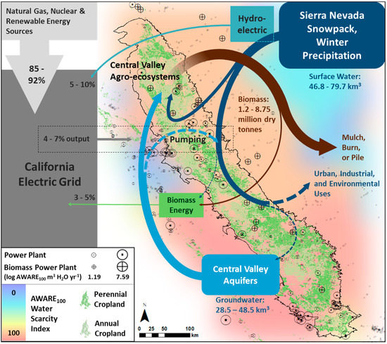 The food-energy-water nexus in California’s Central Valley growing region. When surface water delivery is reduced, as during the 2011–2016 drought, a greater proportion of agricultural water is drawn from groundwater sources, resulting in greater energy requirements and cost to growers—potentially causing reduction in applied water and subsequent agronomic consequences. The quantity of water recharging aquifers either deliberately, or via environmental use, is uncertain, and as such, is represented by a dashed line. Value ranges represent data from wet (2006) and dry (2014) years. Almond orchards produce biomass co-products commonly used as an energy feedstock, in the form of EoL tree removals and shells from post-harvest operations. Electric grid data from [10], biomass data from [11], and water application data from [12,13].