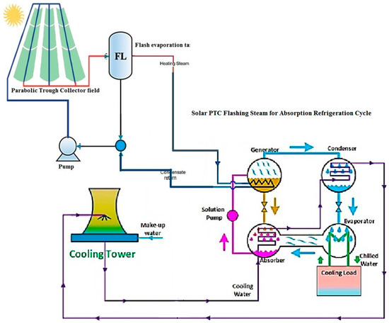 Various types of thermal solar collectors can be coupled with single-effect absorption chillers. Cabrera et al. [28] investigated the utilization of PTC for solar cooling applications. It was concluded that a lightweight and small sized modular PTC can easily be mounted on the building’s rooftop, and ought to be the goal of the producers. A comparison of various cooling technologies combined with PTC is additionally given in [28], and a general overview of the parabolic trough collectors can be found in [29]. Fong et al. [30] compared various solar thermal collectors and cooling systems for air conditioning applications in buildings in tropical areas. They concluded that, for the absorption cycle, the PTC is slightly higher in the consumption of energy than the FPC by 7.3%, which differs from the evacuated tube collectors by 36.5%. A. Aliane [31] explored different case studies on solar thermal absorption systems. Ayman et al. [32] investigated, by a developed model, a proposed design for a pilot test unit of 10 kW electrical power, with capacity for 1.7 m3/day of desalinated water, and 3.6 TR (Ton of Refrigeration) cooling load capacity. The system showed how it was very effective in utilizing solar energy for power generation, water desalination, and air conditioning systems. H2O–LiBr was used for the air conditioning/cooling part. Wang et al. [33] investigated the effect of large temperature gradients and serious nanoparticles photothermal conversion efficiency on direct absorption solar collectors. Rasool Elahi [34] studied the effect of using solar plasma for the enhancement operation of solar-assisted absorption cycles. Related to thermo-economics, Salehi [35] studied the feasibility of using absorption heat pumps to cover space heating load; in this study, absorption compression and absorption (H2O–LiBr and NH3–H2O) -enhanced heat pumps are investigated for heating space loads of 2 MW(Mega Watt). Utilizing geothermal hot springs as heat sources for refrigerant evaporation, the freezing problem is prevented, and the coefficient of performance COP ranged between 1.4 and 1.6.