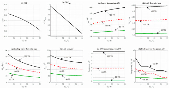 Figure 3 shows the data results based on the effect of absorber temperature on the other design parameters, such as COP, COPmax, exergy destruction rate, mass flow rates, and design aspects. Data has been obtained at different refrigerant loads, from 15 to 45 kW (50 to 150 TR), and different values of absorber operating temperature (30–35 °C). Figure 3a reflects the effect of absorber temperature on COP. Increasing the absorber temperature would cause a slight decrease in the COP. The same behavior has been noticed in Figure 3b as an effect on the COPmax. This was happened because of the following relation between the absorber temperature and the COP and COPmax ().