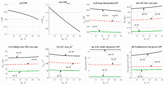 Increasing the load has no effect on the COP and/or COPmax as noticed. In general, the COP was in the range of 0.8 to 0.85. Figure 4c clearly shows that increasing the condenser temperature would decrease the exergy destruction rate, which is considered a remarkable effect. For example, at 45 kW (150 TR) cooling load, the exergy destruction rate has been decreased, from 630 kW down to nearly 580 kW. The obtained results for the behavior of the total mass flow rate are shown in Figure 4d. An increase in condenser temperature augments the mass flow rate. The effect of condenser temperature on the flow rate is not significantly high when compared against the refrigerant load. However, the effect is considered remarkable when compared with the cooling water flow rate (Figure 4e). The condenser temperature would cause an increase in the cooling flow rate, which is considered to be not recommendable according to cost limitations. A slight reduction in the AAC area can be noticed in Figure 4f. For instance, the total AAC area has been decreased, from 160 m2 down to 150 m2, at 45 kW (150 TR) load. Figure 4g shows that there is no effect on the evaporator fan cooler unit. The effect would happen in the case of the change in evaporator temperature. Figure 4h reflects the change in cooling tower mass flow rate by the cause of condenser temperature. The fan power has been increased significantly. The increase in load would increase fan power. Increasing the condenser temperature would increase the power of the cooling tower fan. Generally, decreasing the condenser temperature decreases the cost, with a slight increase in performance too. A value of 43 °C would be recommended in this study for the condenser unit.