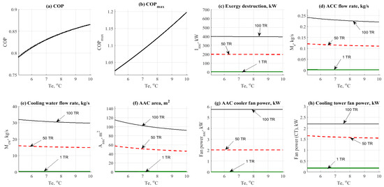 The data results based on the variation of evaporator temperature over the other design parameters (COP, COPmax, exergy destruction rate, mass flow rates and design aspects) are presented in Figure 5. Data has been obtained at different refrigerant loads between 3.5 and 28.5 kW (1 and 100 TR), and different values of evaporator operating temperature (5–10 °C). Figure 5a shows the effect of the evaporator temperature on the COP. Increasing the evaporator temperature would cause a slight increase in the COP. The same behavior can be noticed in Figure 5b as an effect on the COPmax. This happened because of the following relation between the evaporator temperature and the COP and COPmax ().