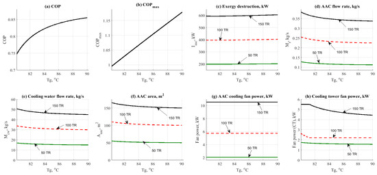Figure 6 shows the data results based on the effect of generator temperature on the other design parameters, such as COP, COPmax, exergy destruction rate, mass flow rates and design aspects. Data has been obtained at different refrigerant loads, between 15 and 45 kW (50 and 150 TR) and different values of the generator operating temperature (80–90 °C). Figure 6a shows the effect of the generator temperature on the COP. Increasing the generator temperature would cause a remarkable increase in the COP. The same behavior can be noticed in Figure 6b as an effect on the COPmax. This happened because of the following relation between the generator temperature and the COP and COPmax ().