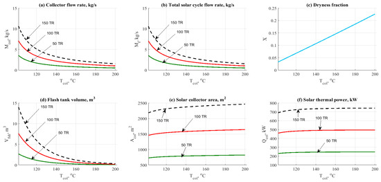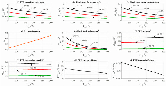 Figure 7 and Figure 8 show the data results based on the effect of solar collector temperature on the other design parameters, such as mass flow rates and design aspects. Data has been obtained at different refrigerant loads, between 15 and 45 kW (50 and 150 TR) and different values of solar collector operating temperature (100–200 °C for ETC, and 200–300 °C for PTC). Figure 7a and Figure 8a show the effect of solar collector temperature on the solar field mass flow rate. Increasing the solar collector temperature would cause a remarkable decrease in the solar field mass flow rate. The main reason for this is related to energy balance across the solar field, as presented in this relation . The same behavior can be noticed in Figure 7b and Figure 8b, as an effect on the total mass flow rate.