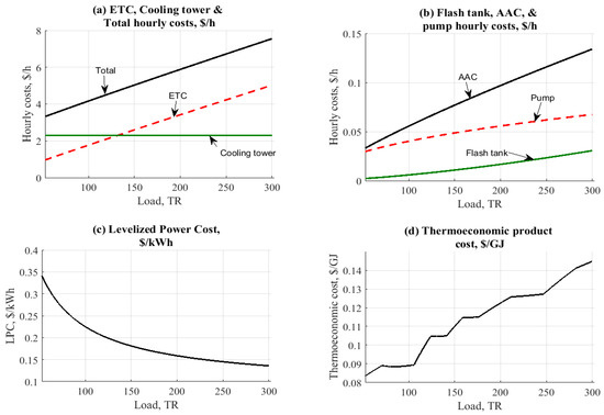 The cooling load effect on ETC-H2O–LiBr and PTC-H2O–LiBr cycles is shown in Figure 9 and Figure 10. Both figures address the effect on hourly costs, levelized power cosst, and thermo-economic product costs. As expected, the behavior in the figure was in increasing mode, due to the load and energy demand for all units. Solar collectors recorded the highest values of hourly costs among the other units, as shown in Figure 9a and Figure 10a.