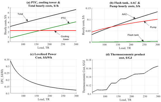 Figure 9c and Figure 10c show the effect of cooling load on the levelized power cost, USD/kWh. The results are nearly the same based on the close results between the two configurations related to the pumping unit and the cooling tower. The levelized power cost ranged between USD 0.15/kWh and USD 0.35/kWh. The same close behavior is noticeable when comparing the thermo-economic product costs. Results were centralized around USD 0.08 to 0.14~0.16/GJ for both configurations, with a minor advantage to the ETC (Figure 9d and Figure 10d). As anticipated, increasing the load would increase the cost of exergy. Solar PTC and/or ETC are considered the main cause of such an effect, related to the large area needed to cover the load.