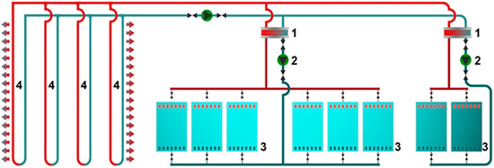 Schematics of the energy system. 1. Plate heat exchangers, 2. Water circulation pumps and precision flow meters, 3. Water flow glazing (WFG), 4. Borehole heat exchangers.