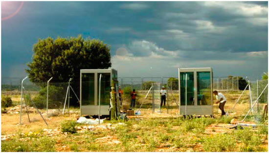 Weather data over the year were recorded and compared with the building energy simulation (BES) model. The indoor temperature sensors were placed below the roof frame in both prototypes. The outdoor and indoor air temperatures were monitored by several thermocouples (error ±0.5 °C). A pyranometer with a spectral response from 280 to 2800 nm, a linear response up to 3000 W/m2, and an absolute error of 3% measured the solar radiation on the horizontal roof.