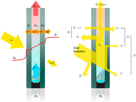 where ṁ is the mass flow rate per unit of area, c is the specific heat of water, Av is the net absorptance of the water chamber, i0 is the direct sun radiation, θIN is the temperature of the inlet water, Ui is the interior thermal transmittance, and Ue is the exterior thermal transmittance. These last two thermal transmittances Ui and Ue measure the heat transfer between the water chamber and indoors and outdoors, respectively. (Avi0) is the sum of the energy absorbed by the water chamber and the energy transferred by convection because of the glass panes absorption. Av comes from Equation (13). It measures the fraction of energy that is absorbed by the water. Regardless of the flow rate, the maximum amount of energy that the water chamber can absorb is Avi0. When ṁ reaches a specific value, gw becomes negligible and the absorbed energy is not transferred indoors. Therefore, the absorbed energy, Avi0, is transported by the water chamber.