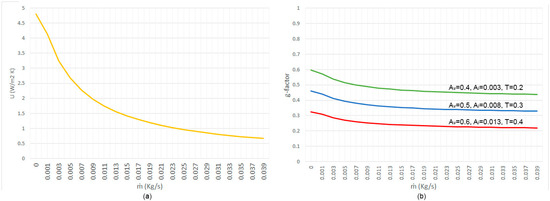 If the flow rate is much higher than the sum of indoor and outdoor thermal transmittances (ṁc >> Ue+ Ui), the values of g and U are denoted with the superscript ON. The g factor of Equation (20) becomes: