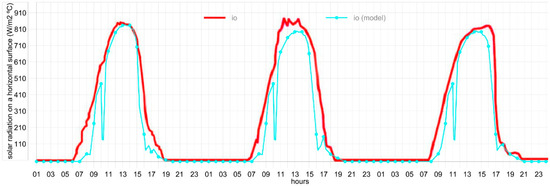 A pyranometer installed on the roof of the prototype measures global solar irradiance. Data acquisition is made through the monitoring system. Figure 7 shows the irradiance curve corresponding to the selected days (23/08/2010, 24/08/2010, and 25/08/2010). As it is shown, the selected days were clear. When the day is clear, direct beam radiation predominates over diffuse radiation. However, when the day is cloudy, almost all the irradiance is diffuse. Likewise, the simulation curve (printed in cyan) shows the typical irradiance curve reaching maximum levels of around 800 W/m2. Over the first hours in the morning (from 09:00 to 13:00 h), and in the late afternoon (after 18:00 h), the roof is shaded and the irradiance is mainly diffuse reaching values around 200 W/m2. However, throughout the central hours of the day, the roof is exposed to direct solar radiation.