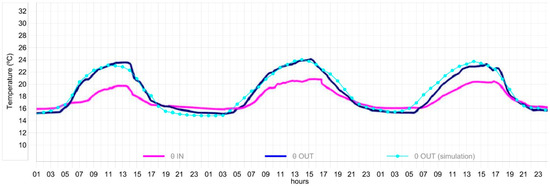 Figure 7 shows how the measured curves of the solar irradiance (printed in a continuous line) replicate the simulation curve (printed in a continuous line with marked dots), following the same shape and remarkably similar values slightly over 800 W/m2, which would be expected for the summer period in this location. This prototype is simulated in the actual location and the weather file is the standard EPW file (EnergyPlus Weather).