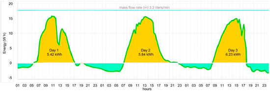 Using Equation (23) and the values taken from Figure 8, the daily energy per unit of surface that the flow of water can transport was calculated. WFG stops this energy from heating up the prototype. It explains the difference in temperatures between the WFG cabin and the Reference cabin. This energy is released through the borehole heat exchangers. Figure 10 shows the energy absorbed by the horizontal WFG. The daily average absorbed energy was 5.8 kWh in 3.5 m2, so the ratio of energy per area is 1.66 kWh/m2. Table 2 illustrates the energy balance between energy absorption and the electric consumption of the circulation water pumps. The circulation pump was working 24 h per day, and its steady power was 25 W. The average daily use of the circulation pump to provide the WFG with a flow rate of 0.9 L per minute was 0.58 kWh, which represents a 10% of the energy absorbed by the water. The net energy savings were 1.49 kWh/m2.