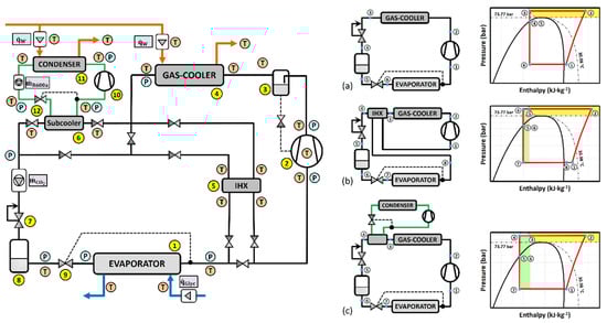 Schematic diagram of the experimental refrigeration plant including the analyzed configurations: (a) Base cycle, (b) IHX cycle and (c) MS cycle.