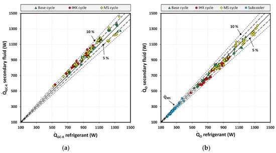 The variables of cooling capacity (), heat rejection capacity () and subcooling effect from the mechanical subcooling system (), can be calculated by either the main refrigerant (CO2) or the secondary fluid (water and propylene-glycol, water or R600a, respectively). A comparison between both allows us to check the proper operation of the refrigeration facility and the data acquisition system as well as the correct thermophysical property calculation. Equations (1)–(6) show how thermal powers have been calculated and Figure 2 depicts the average values obtained from these equations with the standard deviation as bar error.