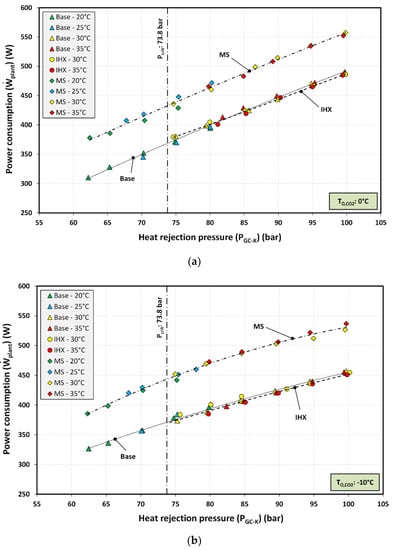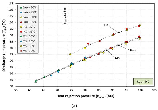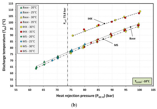 The main variables to affect the discharge temperatures are the temperature and the pressure at the compressor suction port, and the discharge pressure. Since the mechanical subcooling unit does not affect the inlet conditions of the CO2 compressor, the discharge temperature will remain similar to the Base cycle. However, the use of the IHX modifies the suction temperature and, consequently, the discharge temperature will change. Figure 3 shows how the discharge temperature is affected by the configuration used at the evaporating temperatures of 0 and −10 °C.