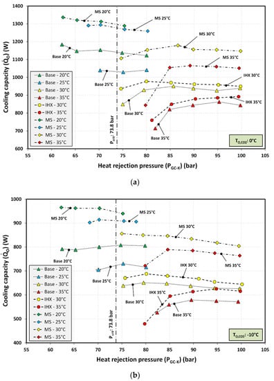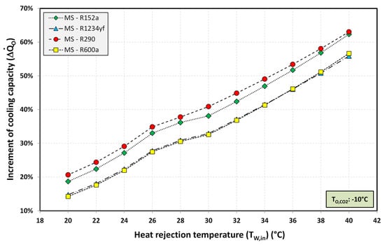 Cooling capacity is obtained by Equation (2) as a product between the mass flow rate driven by the CO2 compressor () and the specific cooling capacity in the evaporator. Since the superheating degree at the evaporator is maintained by the thermostatic valve, the enthalpy at the evaporator outlet remains constant and the provided cooling capacity depends on both, the refrigerant mass flow rate and the enthalpy at the evaporator inlet. The mass flow rate is hardly affected by the presence of the mechanical subcooling unit because the pressure ratio is set externally and the properties at the compressor suction port do not vary. However, the use of IHX introduces extra superheating that implies a mass flow reduction depending on the operating conditions [49,50]. Regarding the enthalpy evaporator inlet, the use of both subcooling systems lowers the temperature at the back-pressure valve inlet so the specific cooling capacity will be increased if an isenthalpic process is assumed in both expansion devices.