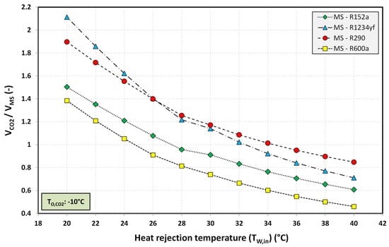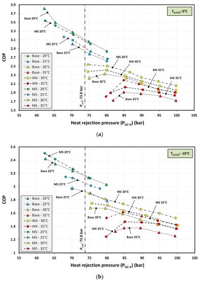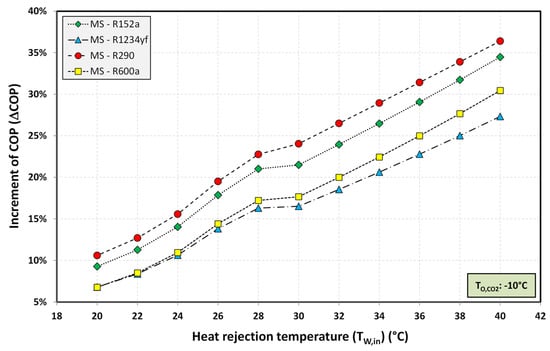 Figure 6 presents the average COP for the evaporating temperatures of 0 and −10 °C at the different heat-rejection temperatures. Taking the Base cycle as a reference, it can be affirmed that the subcooling effect enhances the COP of the refrigeration facility especially at high-rejection temperatures and low evaporating levels. These results are in agreement with those published by Torrella et al. [49] and Nebot-Andrés et al. [38] at the heat-rejection temperatures of 30 and 35 °C. However, for temperatures below 30 °C, there is no experimental data published up to now that evidence the suitability of using the MS system taking the COP as a reference. Accordingly, the results depicted in Figure 6 evidence that for 20 °C the MS cycle is unsuitable because the COP of the modified system is similar to or lower than the Base cycle. For 25 °C, only at the evaporating level of −10 °C the use of the MS cycle reports a COP greater than the Base cycle.
