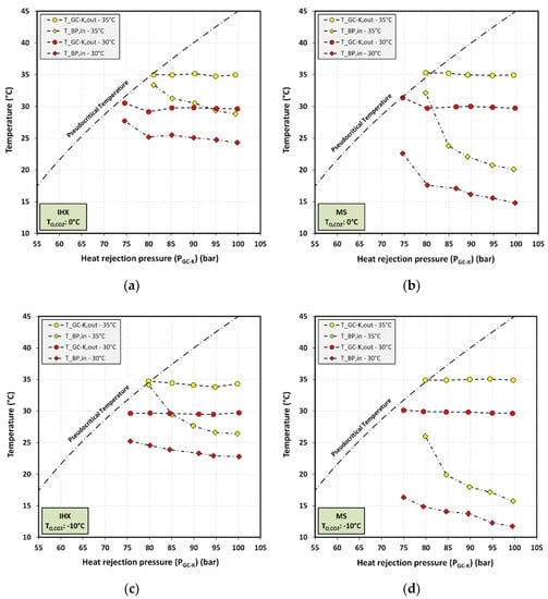 Finally, the trend of the temperature at the back-pressure inlet (TBP.in) changes sharply near the pseudocritical temperature (dotted line). This abrupt change is due to the high values reached by the specific heat near the critical point which main consequence is the reduction of the subcooling effect according to Equation (8). This reduction directly affects the trend of the COP curve depicted in Figure 6 especially at the heat-rejection temperatures of 30 and 35 °C: