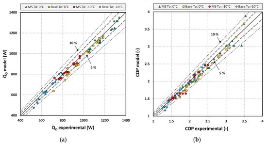 Figure 8 compares the experimental and the theoretical results for the parameters of COP and cooling capacity. As it can be shown there is a good agreement between the averaged experimental data and the results from the computational model. In terms of cooling capacity, more than 91% of data have a deviation of ≤6%, while for COP, more than 83% of data have a deviation of ≤6%. Therefore, we can affirm that the developed model can be adopted as a reliable one.