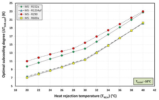 According to Table 4 the increment of COP is higher the lower the evaporating level and the higher the heat-rejection temperature become. This trend is similar for cooling capacity, except for one test with mechanical subcooling (25 °C at 0 °C). Regarding optimal pressure, the subcooling process lowered the optimal heat-rejection pressure from 0.4 to 4.6 bar depending on the configuration. This reduction affects positively the stability of the refrigerating plant minimizing the sharpest drop of COP when it operates close to the pseudocritical temperature [52]. Again, it is important to remark that the previous results are obtained from a non-optimized MS cycle.