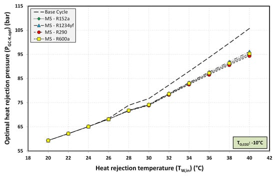 Because transcritical cycles are normally designed to operate with the maximum COP, Table 4 provides the values of the energy parameters at this operation point. The most representative parameter to fix the maximum COP is the heat rejection pressure which is commonly called optimum pressure (PGC-K.opt) [52]. This pressure included in Table 4 is obtained by the least-square best-fit method using the experimental data. Once the optimum pressure is determined, the energy parameters are estimated by a linear interpolation method.