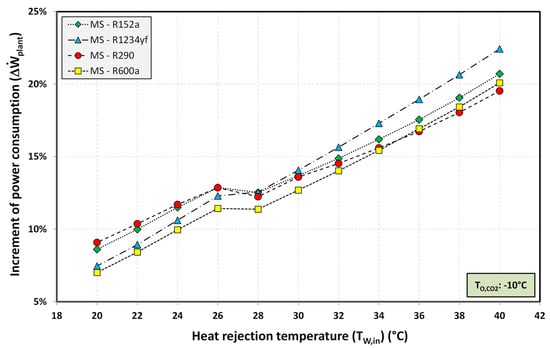 Figure 4 presents the average power consumption of the refrigerating plant excluding the auxiliary consumptions of secondary fluids pumps or control devices. The deviation during tests is presented as bar errors which value is very small. The use of an R600a mechanical subcooling unit adds extra power consumption rated from +9.3 to +22.2% concerning the base-cycle. These results are under the experimental results by Nebot-Andrés et al. [38] which increments were ranged from 17.6 to 19.0%. Taking into account that the present study is performed with a non-optimized MS cycle, it is expected that the power consumed by the refrigerating plant will be reduced if the subcooling degree is optimized and a suitable refrigerant is selected.